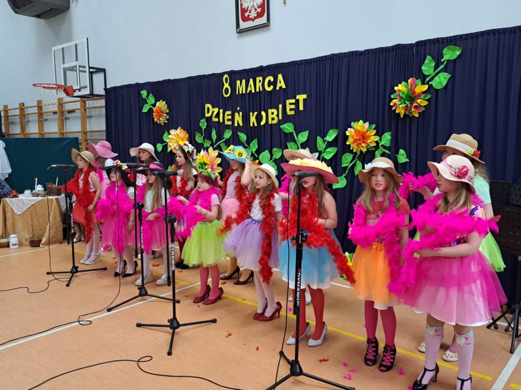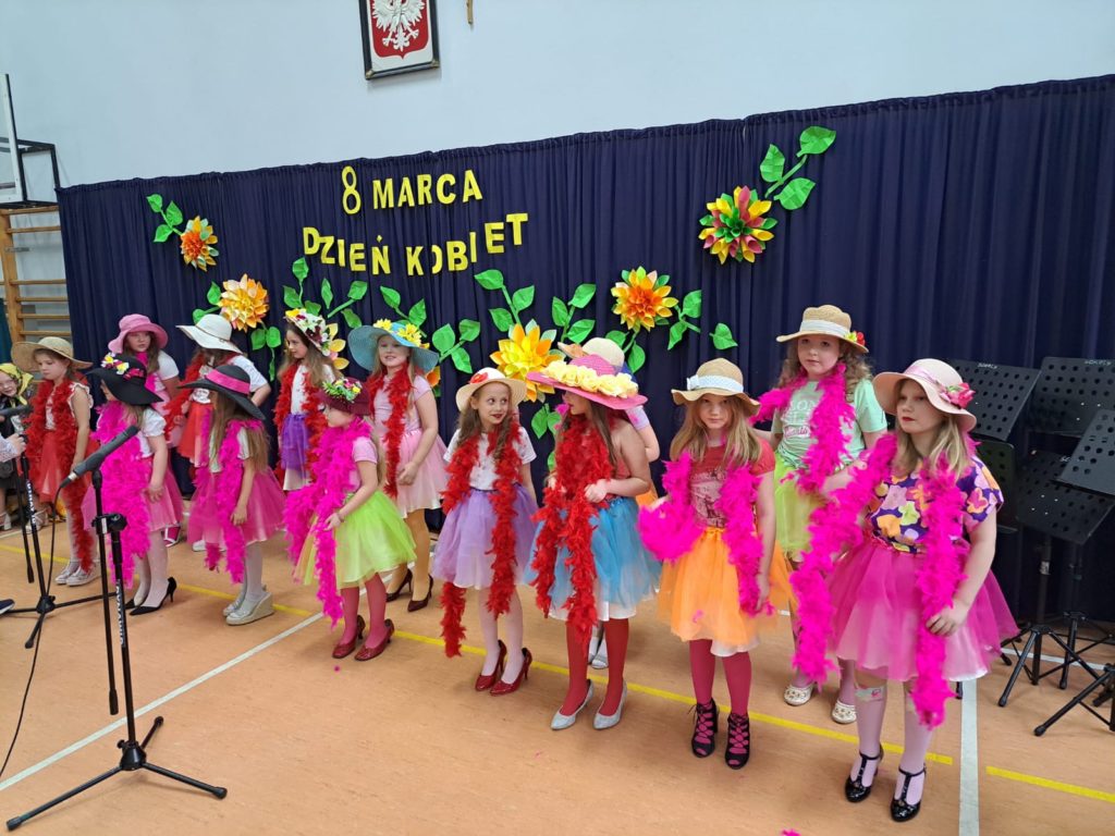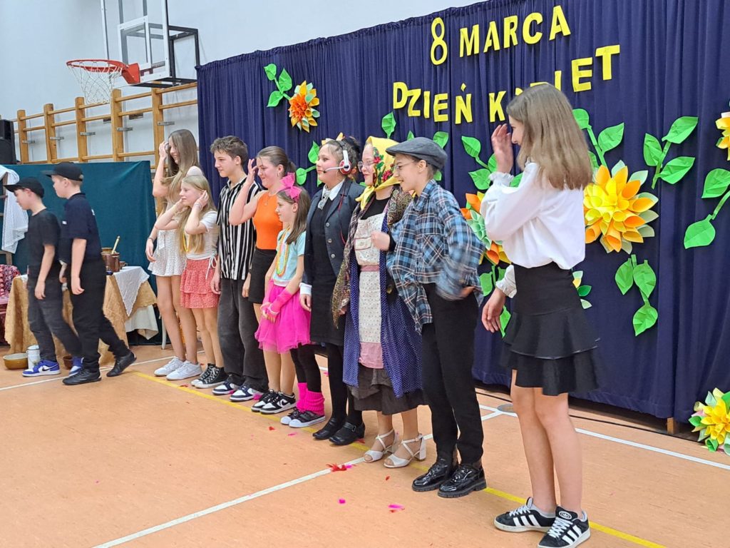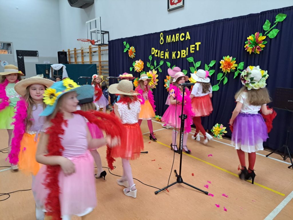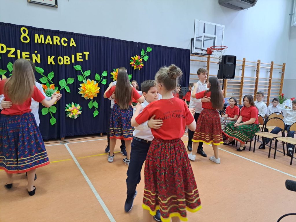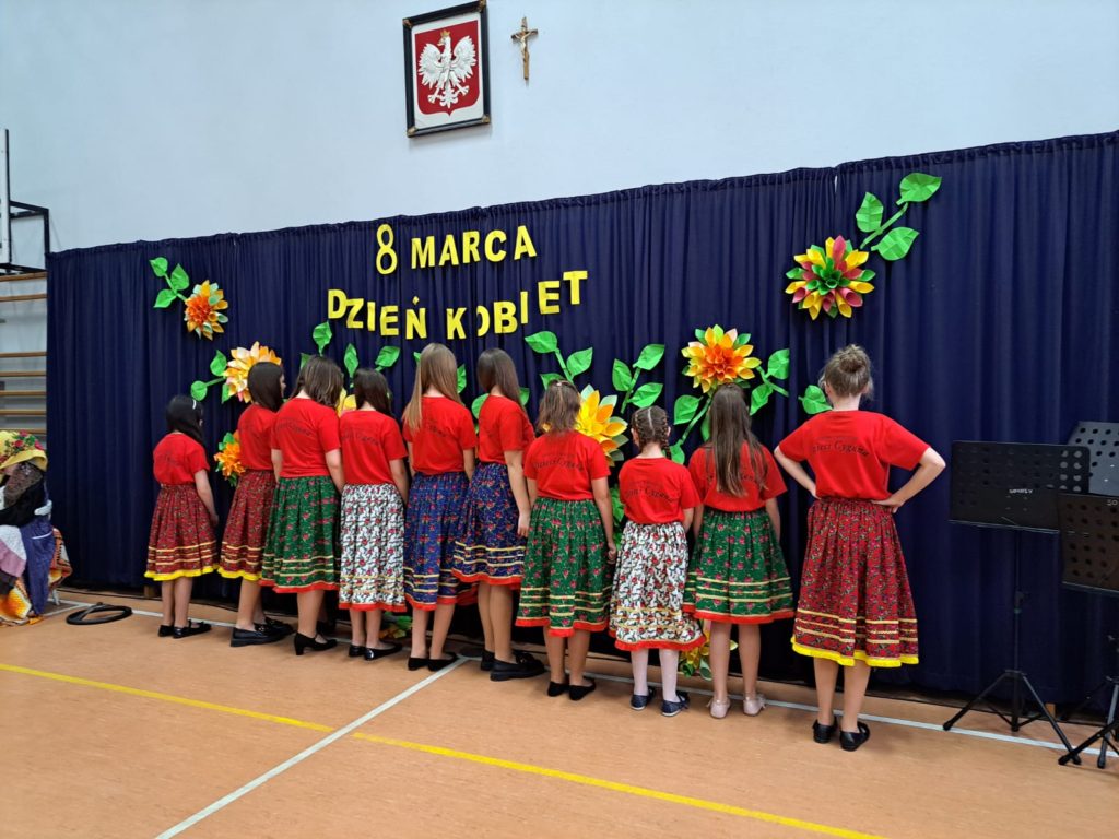 Część artystyczną zainaugurował Zespół Taneczny „Dzieci Cygana”, który wprawił wszystkich w klimatyczny nastrój, wykonując energetyczną wiązankę tańców towarzyskich. Również uczniowie i uczennice ZSP mieli wspaniały wkład w artystyczny program Gminnego Dnia Kobiet: najpierw na scenie zaprezentowały się najmłodsze dziewczęta szkoły, wykonując znany utwór pt. „Być kobietą”, a ich występ dopełniły kolorowe stroje i taneczna choreografia. W świat klasyki i elegancji przeniosła nas uczennica klasy VII, wykonując ponadczasowy utwór „Fly Me to the Moon”. Na koniec Szkolne Koło Wolontariatu przygotowało dla widzów scenkę rodzajową – niebanalną historię, która wywołała rozbawienie oraz uśmiechy na twarzach publiczności.