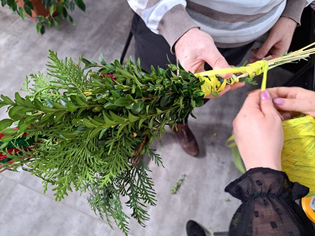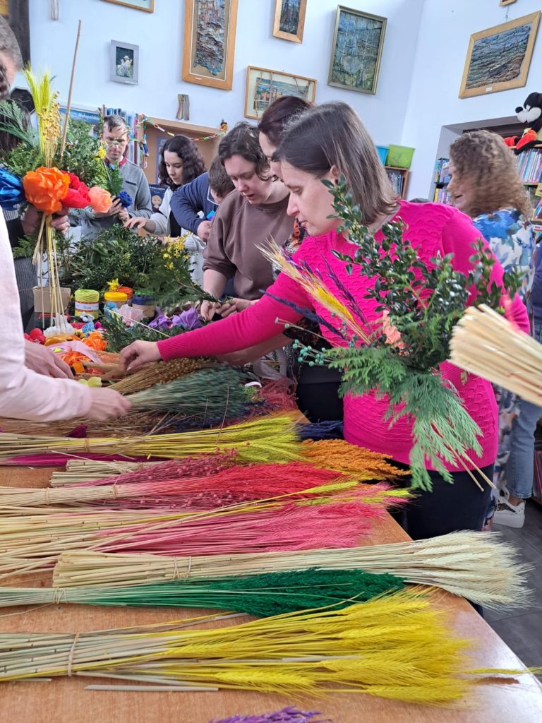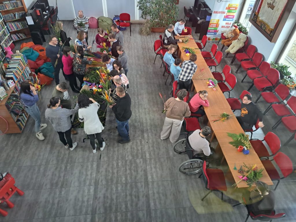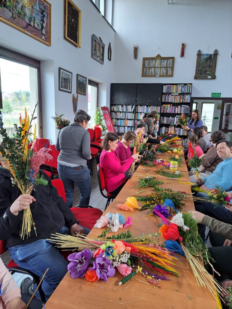 Uczestnicy warsztatów przynieśli ze sobą różnorodne materiały do tworzenia palm – gałązki wierzby, suszone trawy, bukszpan, bibułę oraz kolorowe wstążki. Dzięki temu każda palma była niepowtarzalna i wyjątkowa. Co więcej, piękne, ręcznie wykonane kwiaty z bibuły, które ozdobiły palmy, przygotowały wcześniej panie z Koła Gospodyń Wiejskich z Czubrowic. Ich kolorowe kompozycje stały się sercem wielkanocnych palm, a jednocześnie doskonałym przykładem kunsztu ludowego rękodzieła.
